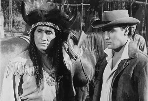 | Elvis recebe cocar comemorativo da tribo Kiowa durante as filmagens de Flaming Star |